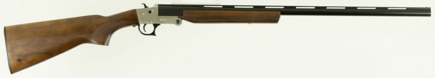 This 12 gauge single shot shotgun features a silver receiver finish and a vent rib barrel with a blued metal finish. It also has a brass bead front sight and a cross-bolt safety.
